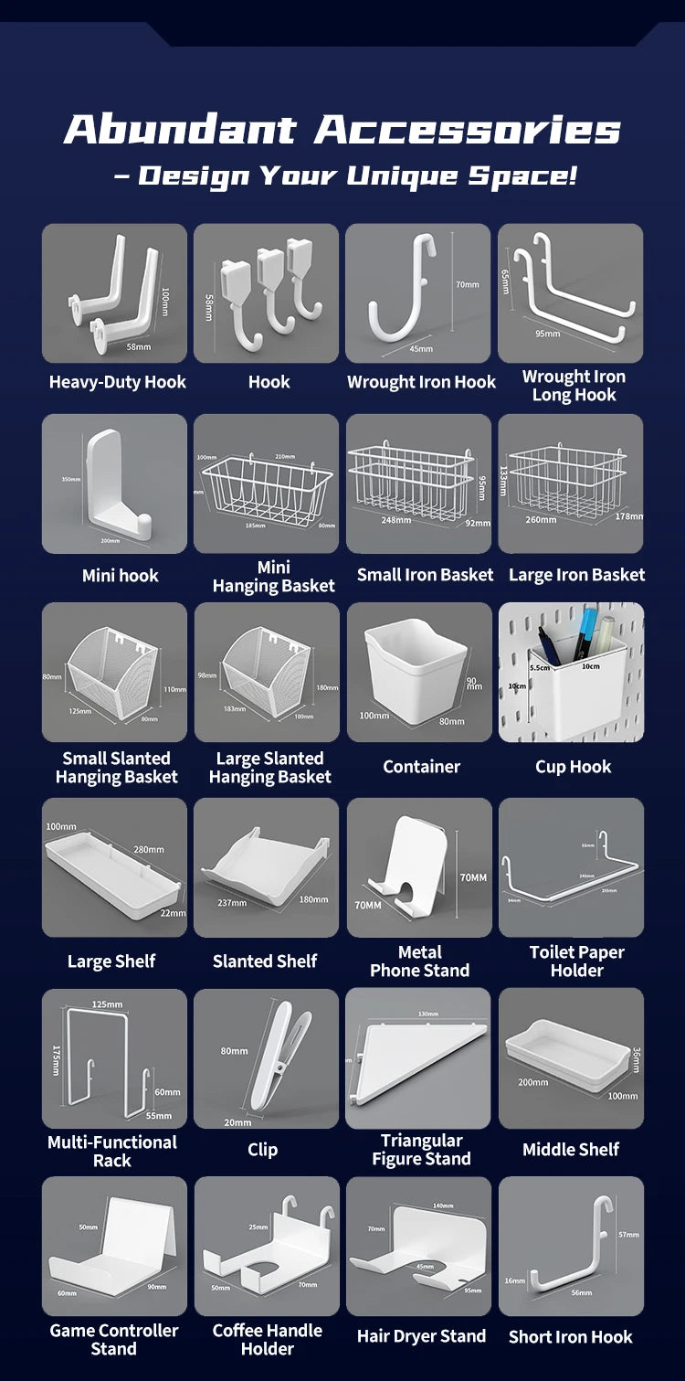 <p>A wall-mounted system for organizing your entire desk setup. No drilling required. Mix and match hooks, baskets, and holders to build the layout that works for you.</p>